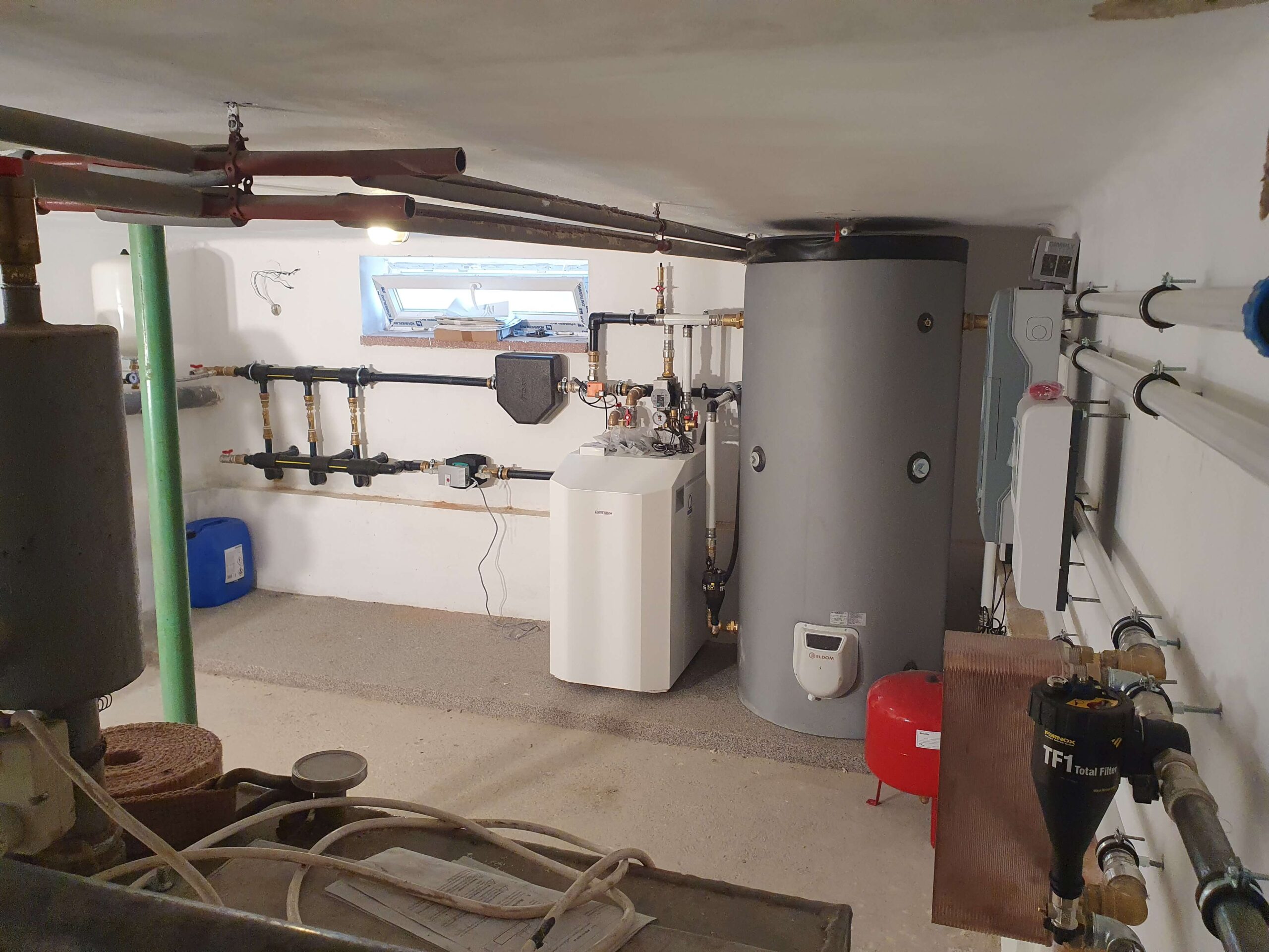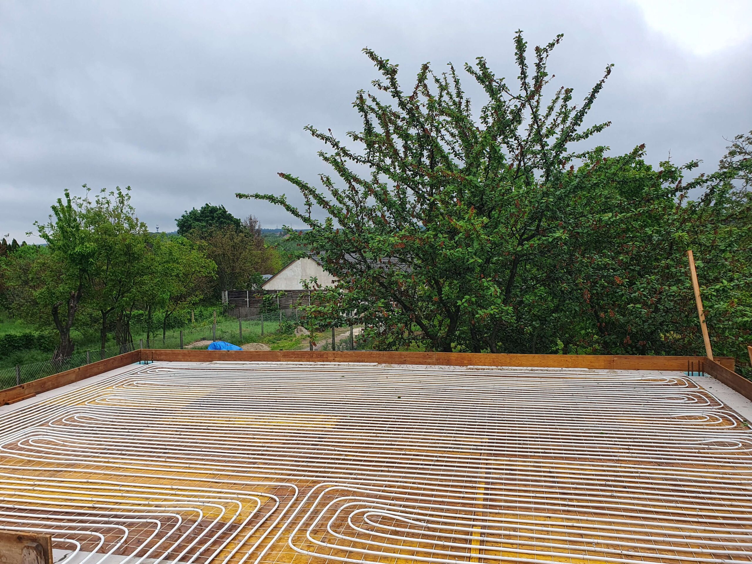• Eközben a talajszondákat bevezetjük az épületbe, amely kis földmunkával jár (árokásás), feltöltjük a rendszert kezelt fűtési vízzel, és bekeverjük a fagyálló folyadékot a talajszondákba.